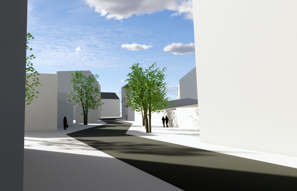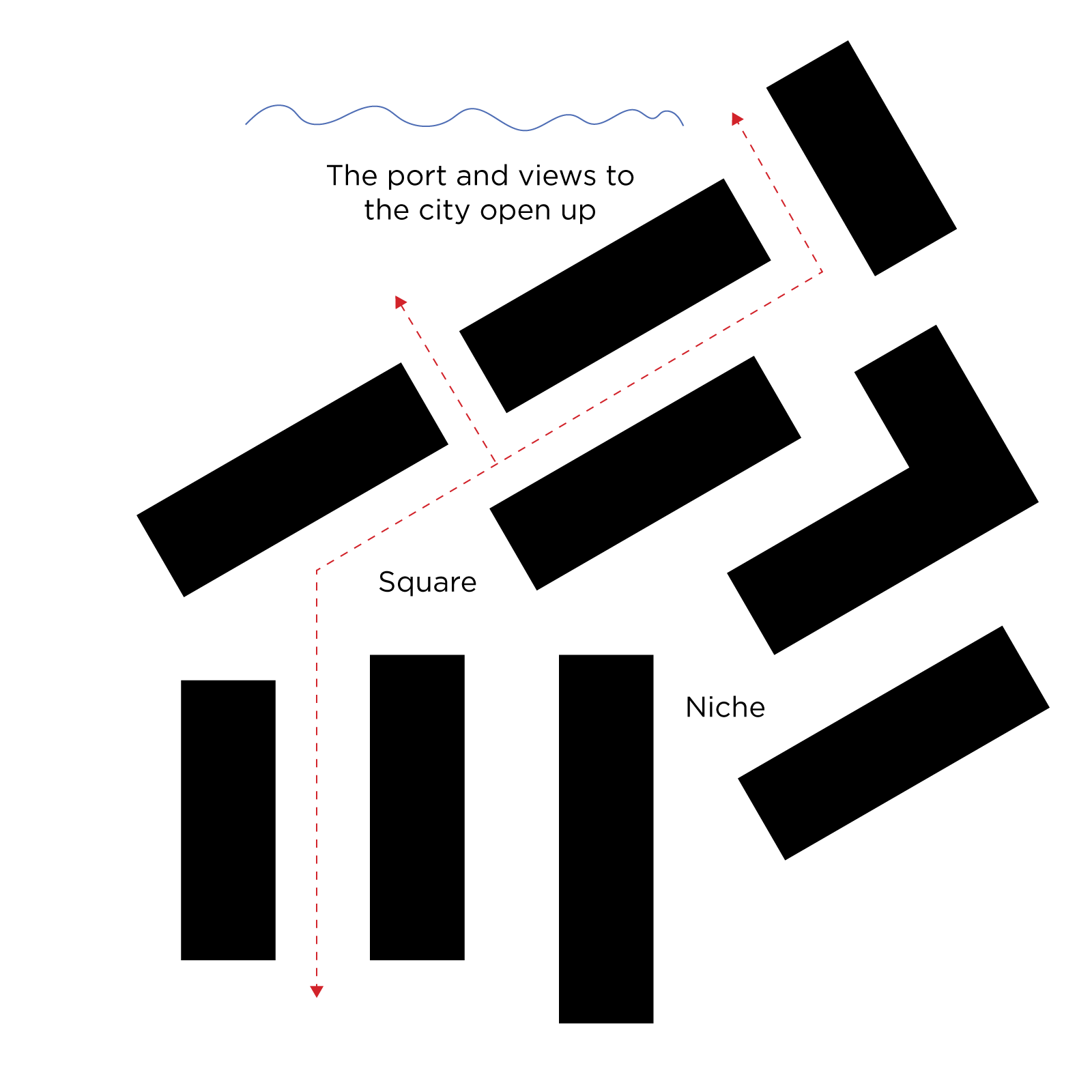 No square blocks erected in a rigid grid, but rectangular new-builds in a varied design language — that are placed in such a way that a number of very diverse urban spaces will emerge between them.
